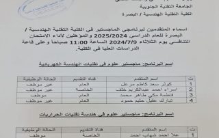 الكلية التقنية الهندسية البصرة تعلن اسماء الطلبة المشمولين بأداء الامتحان التنافسي لطلبة الدراسات العليا