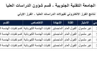تعلن عمادة الكلية التقنية الهندسية البصرة عن نتائج الفرز الالكتروني اسماء الطلبة المقبولين لقبولات الدراسات العليا-الفرز الاولي للعام الدراسي 2026/2025
