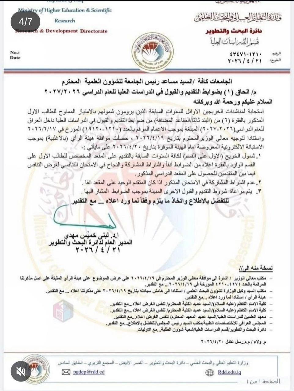استنادًا إلى توجيهات وزارة التعليم العالي والبحث العلمي / دائرة البحث والتطوير، تعلن شعبة الدراسات العليا عن أبرز ما ورد في ضوابط التقديم والقبول في برامج الدراسات العليا للعام الدراسي 2026/2027، وذلك على النحو الآتي: