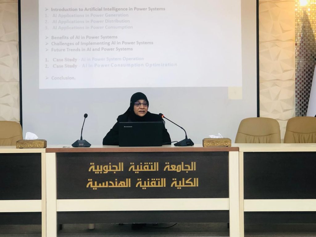 The session was delivered by Assistant Lecturer Wafeeqa Abdulrazzaq Hassan, and included an overview of the fundamental concepts of smart electrical systems, mechanisms for integrating artificial intelligence technologies, and a discussion of the key challenges and opportunities in this field.